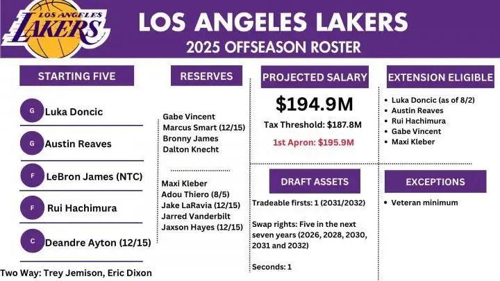 湖人今夏可交易的选秀资产只有一个首轮(2031年或2032年)以及一个次轮,此外湖人还有5个首轮互换权(2026、2028、2030、2031、2032年)。